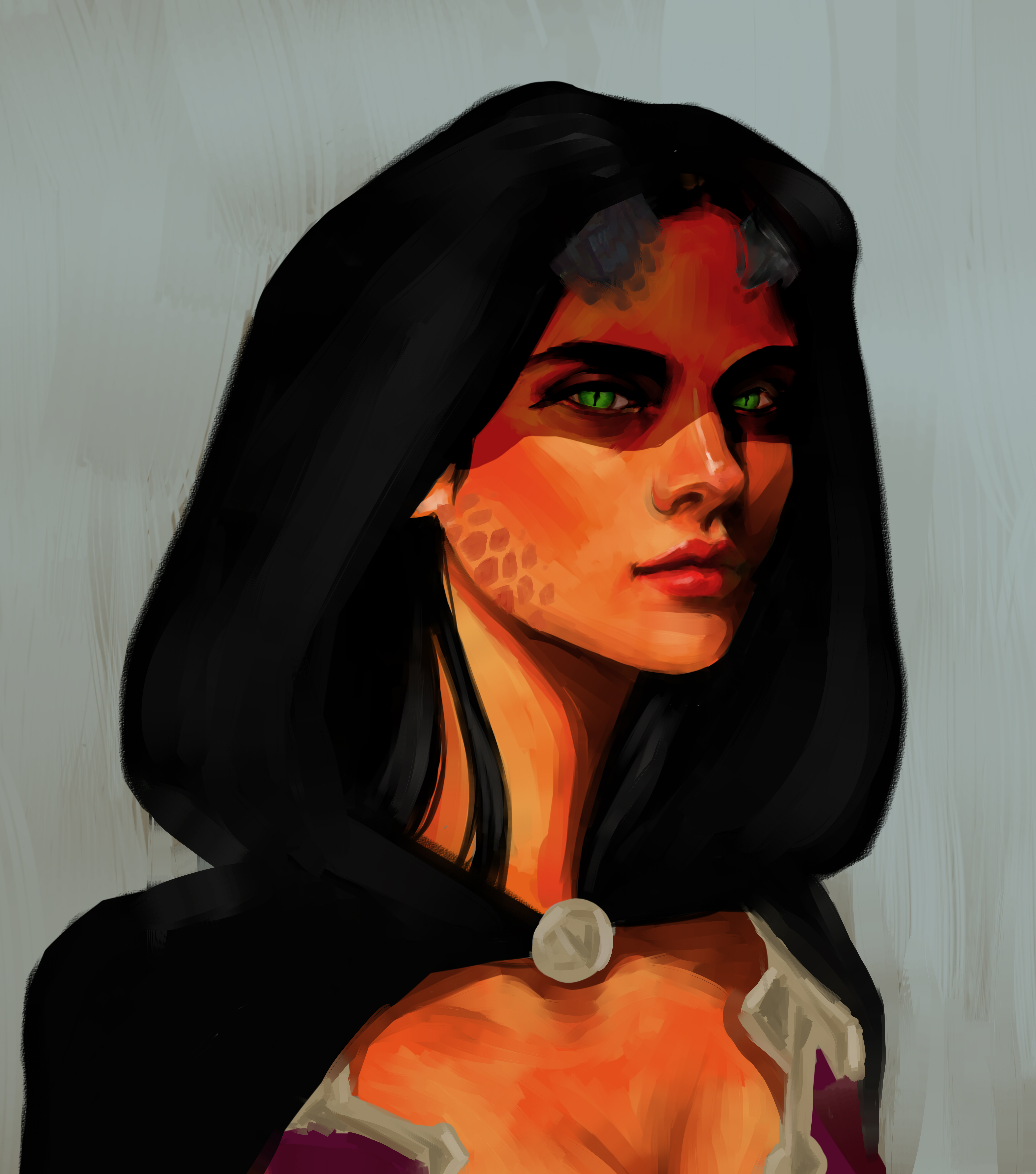 Elisabeth is a young adult bronze-skinned Tiefling. Like other members of the Dragoness Family, parts of her skin are covered with segments of dark orange scales. She’s of slender build, and has green lizard-like eyes. Two horns protrude from her forehead, wrapping backwards over her head and dark-colored hair.