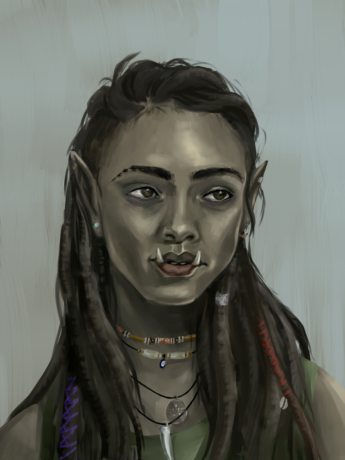 Robin is a muscular, relatively slender half-orc woman. Due to her heritage, her lower canines protrude from her mouth, and her skin is greenish grey in tone. She has black braids and dreadlocks for hair, with colored accents wrapped around some of the dreads. Thanks to becoming infused with Baghtru’s Gloves, her fingers and hands have stonestring woven through them; hair-thin flexible wires that solidify when used with aggressive force.
