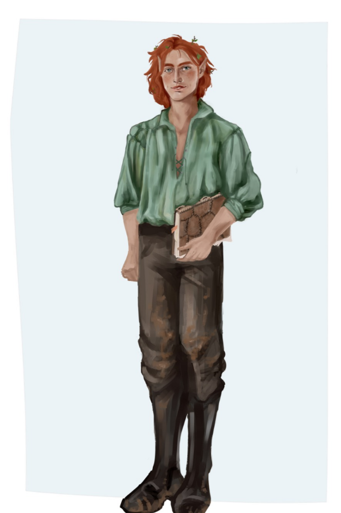 Roderick is a Half-Elf of shorter stature, with pointy ears and a very slightly darkened skin due to his Wood elven heritage. His hair is a prominent fiery red.